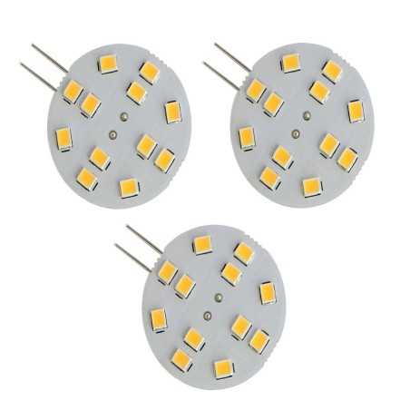 3 Ampoules LED G4 12V 2.0 watts 190 lumens blanc chaud 3000K. Les lampes LED G4 sont dotées de deux contacts métalliques distants de 4 mm. Ces contacts servent de connexion pour les douilles de lampes G4 de 12 volts. Notre lampe G4 de 3000 Kelvin fournit une lumière chaud. L'angle de rayonnement de cette lampe G4 est de 120° ce qui permet d'obtenir un éclairage uniforme.